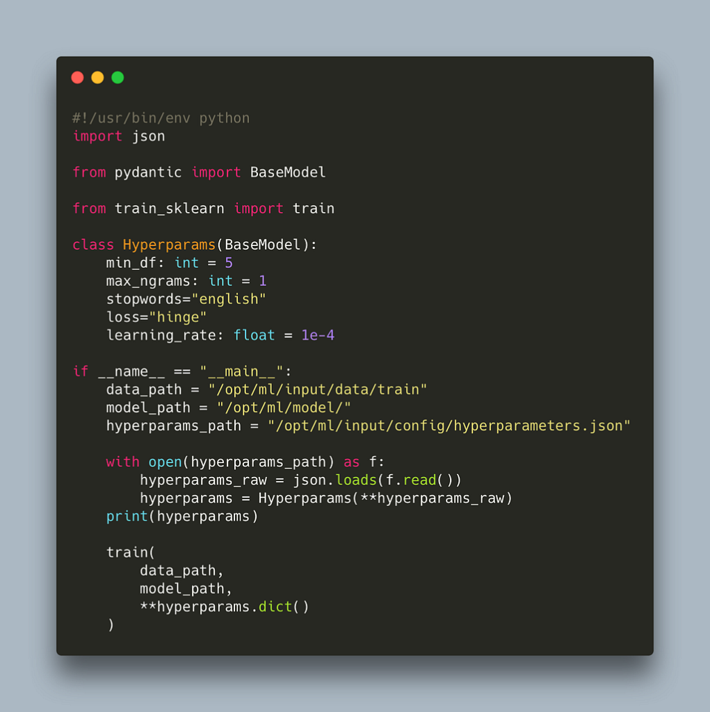 It is important to include #!/usr/bin/env python so that SageMaker knows how to run the script. In the absence of sagemaker-training, the paths are not initialized in environment variables and the hyperparameters are not read and passed automatically, so we need to do that ourselves. The predefined locations that SageMaker used are