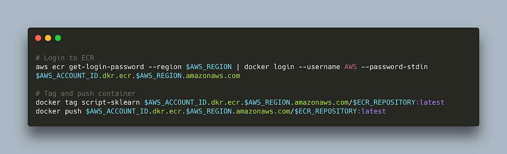 To be able to run the job using AWS infrastructure we need to push our container to ECR. Here is a small bash script that does this (read more here)
