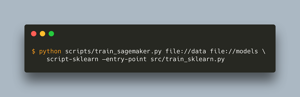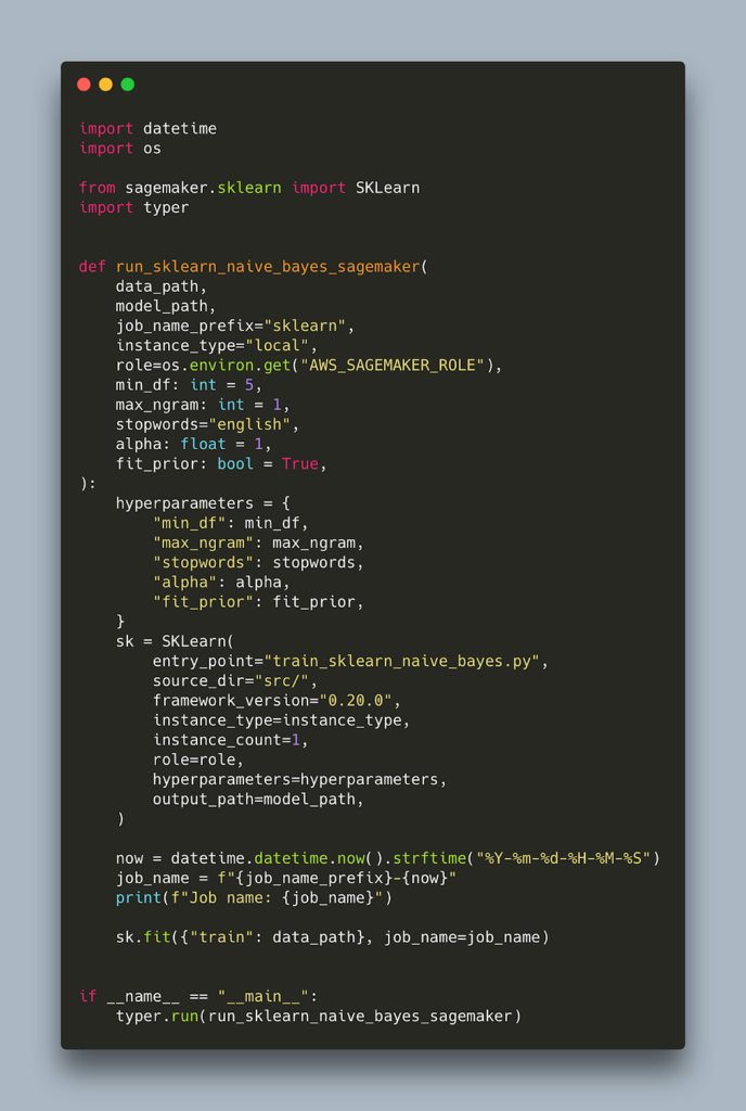 In order for SageMaker to run our job, we need to include any additional files that are required. We can do that via the source_dir parameter that all SageMaker Estimators (e.g. SkLearn, PyTorch, HuggingFace, etc.) expose. As the name hints, this allows us to specify a directory with our source code which should be included. This is our src folder.