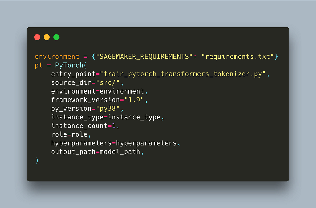 The only thing we have to change for SageMaker to pick up our additional libraries is an environment variable called SAGEMAKER_REQUIREMENTS. This variable needs to point to our requirements.txt. We can define environment variables to be passed inside the container using the environment parameter of our estimator.