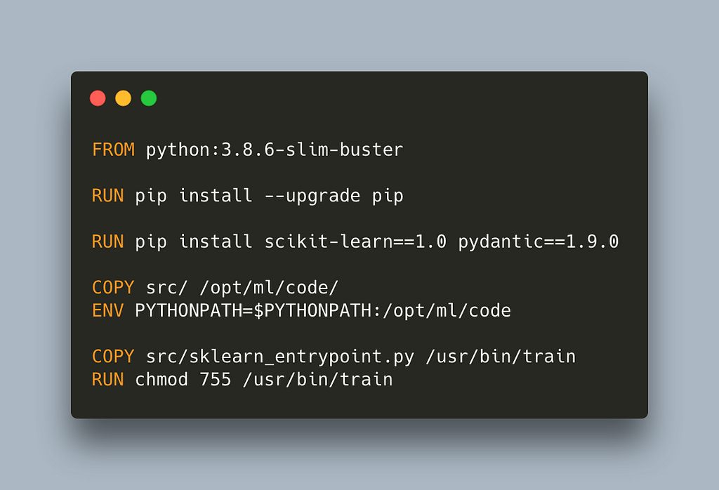 Notice that we need to copy our code. This makes it slightly less flexible as we will need to rebuild and push our container whenever we make any change to the training. We also need to name our entrypoint python script train, and make it executable intentionally because SageMaker will look for and run train upon start, and it will fail if it cannot find it. Note that we also update the PYTHONPATH to make our code visible from the train entrypoint script so that the imports work.