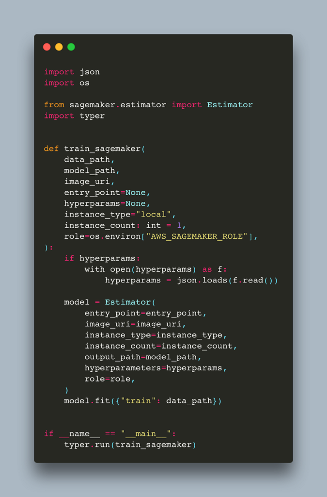 Notice that we do not pass any code. The intention is to create an environment with all libraries needed and pass the training script and any additional source files when invoking the job, similar to what we have been doing with the preconfigured containers. This is called Script Mode mode in SageMaker, and in order for it to work we need to have sagemaker-training installed. Let’s build our container